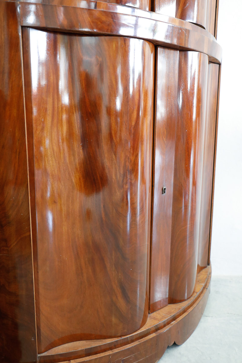 Angoliera doppio corpo, con quattro porte, mossa nella parte centrale, in mogano e piuma di mogano, con rosoni sulla cimasa. Origine Paesi Scandinavi, Epoca Biedermeier.