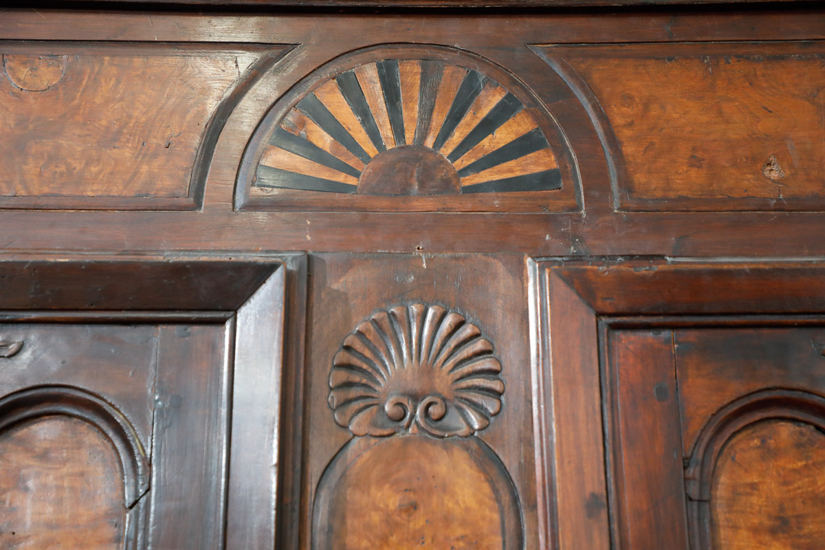 Armadio in noce con pannelli in radica di olmo, Francia fine 700, intarsio a ventaglio e ferrature originali.