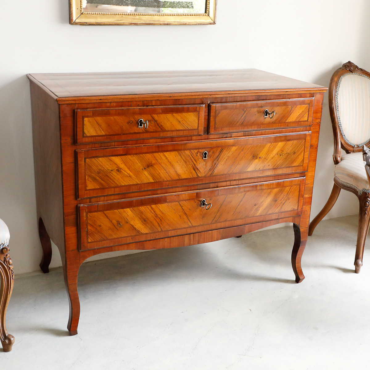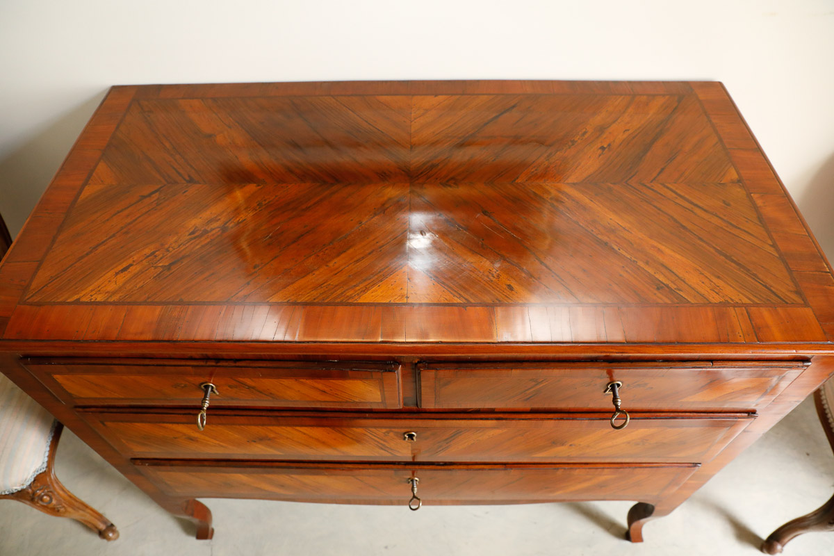 Comò balestra in noce con 4 cassetti, game mosse, Origine Italia, Epoca 700.