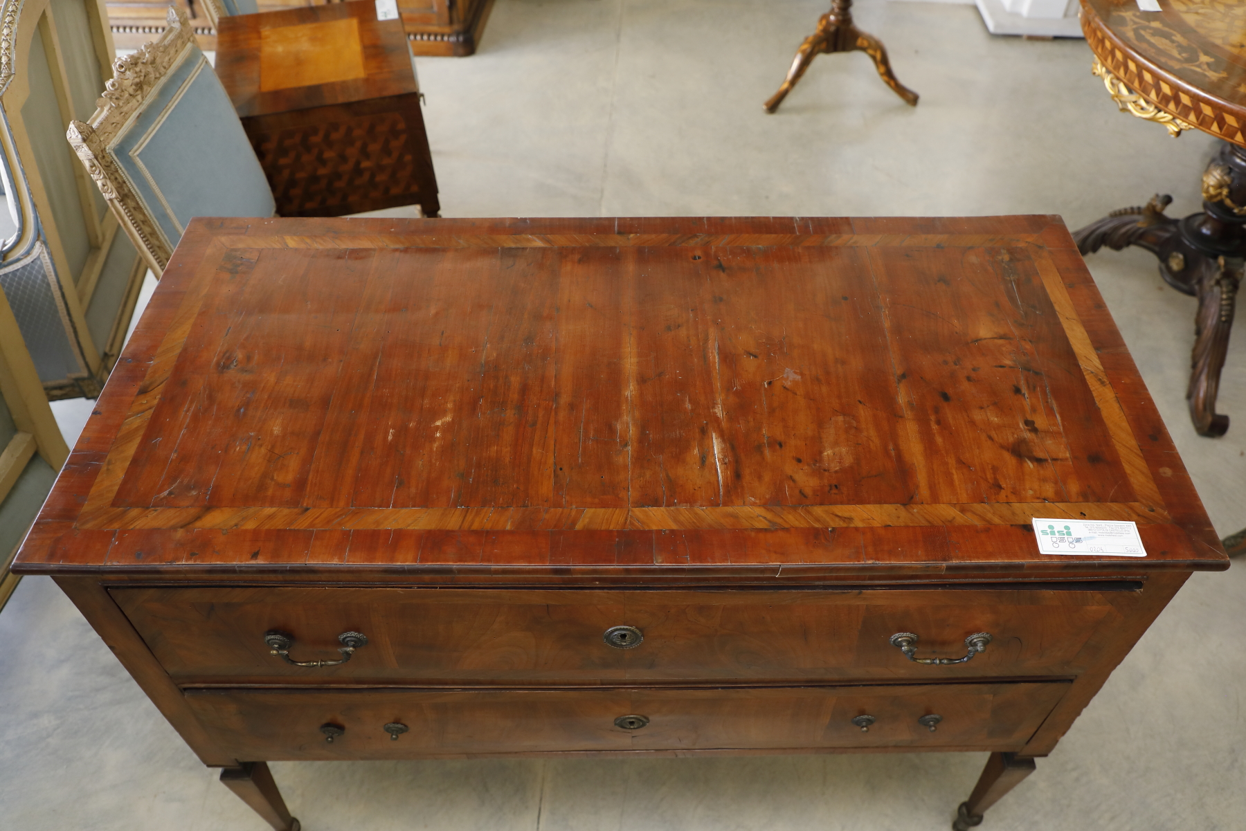 Comò di origine italiano epoca Luigi XVI lastronato in noce e filettato con due cassetti .Misure : 120×56,5x h.92