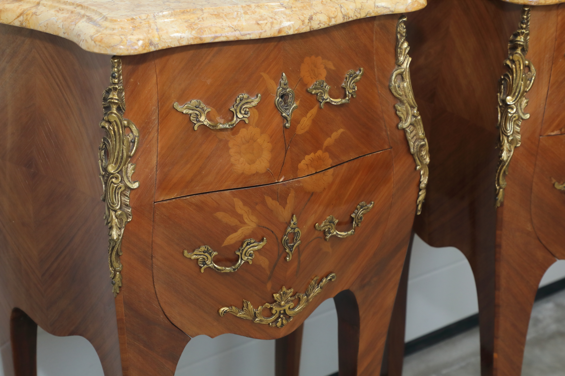 Coppia di comodini mossi in bois de roses con intarsi a motivi floreali ,bronzi e maniglie dorate ,piano di marmo giallo Siena.Misure : 45x28xh.76 Origine Francese Epoca Napoleone III