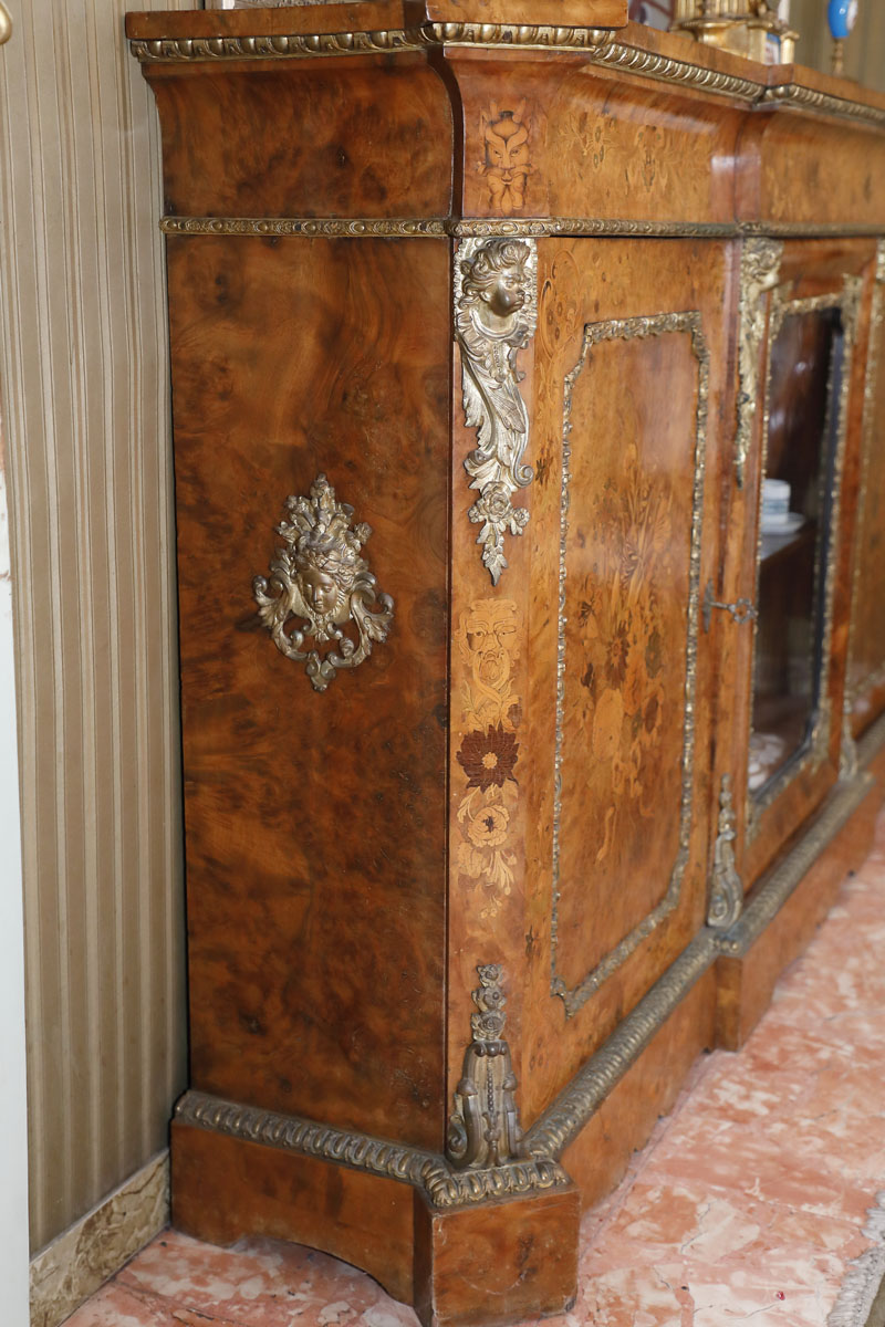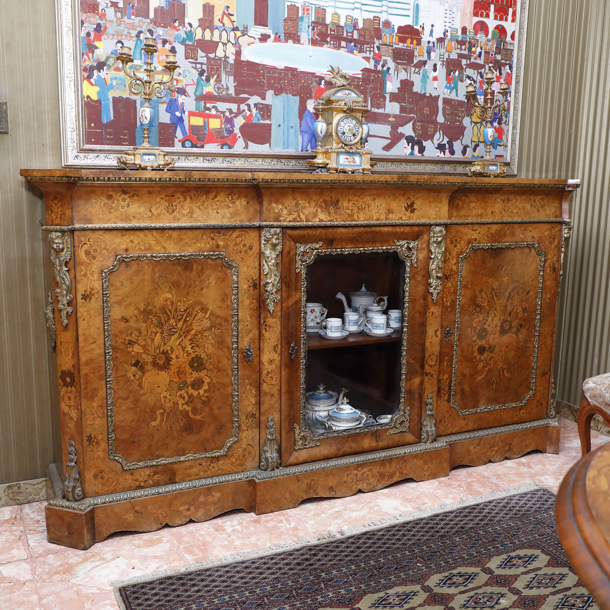 Credenza a tre ante in radica di noce con marchettatura a motivi floreali e finiture in bronzo dorato, Origine Inglese, Epoca Vittoriana.
