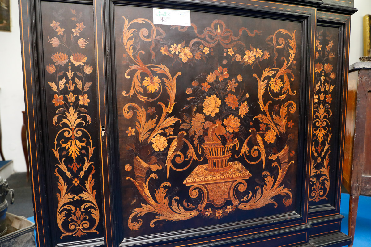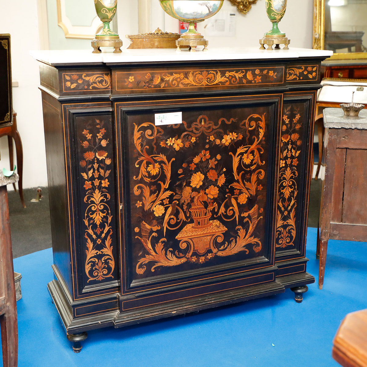 Credenzina ad un’anta in legno ebanizzato con intarsi in varie essenze, piano in marmo, Origine Inghilterra, Epoca Tardo Vittoriana.