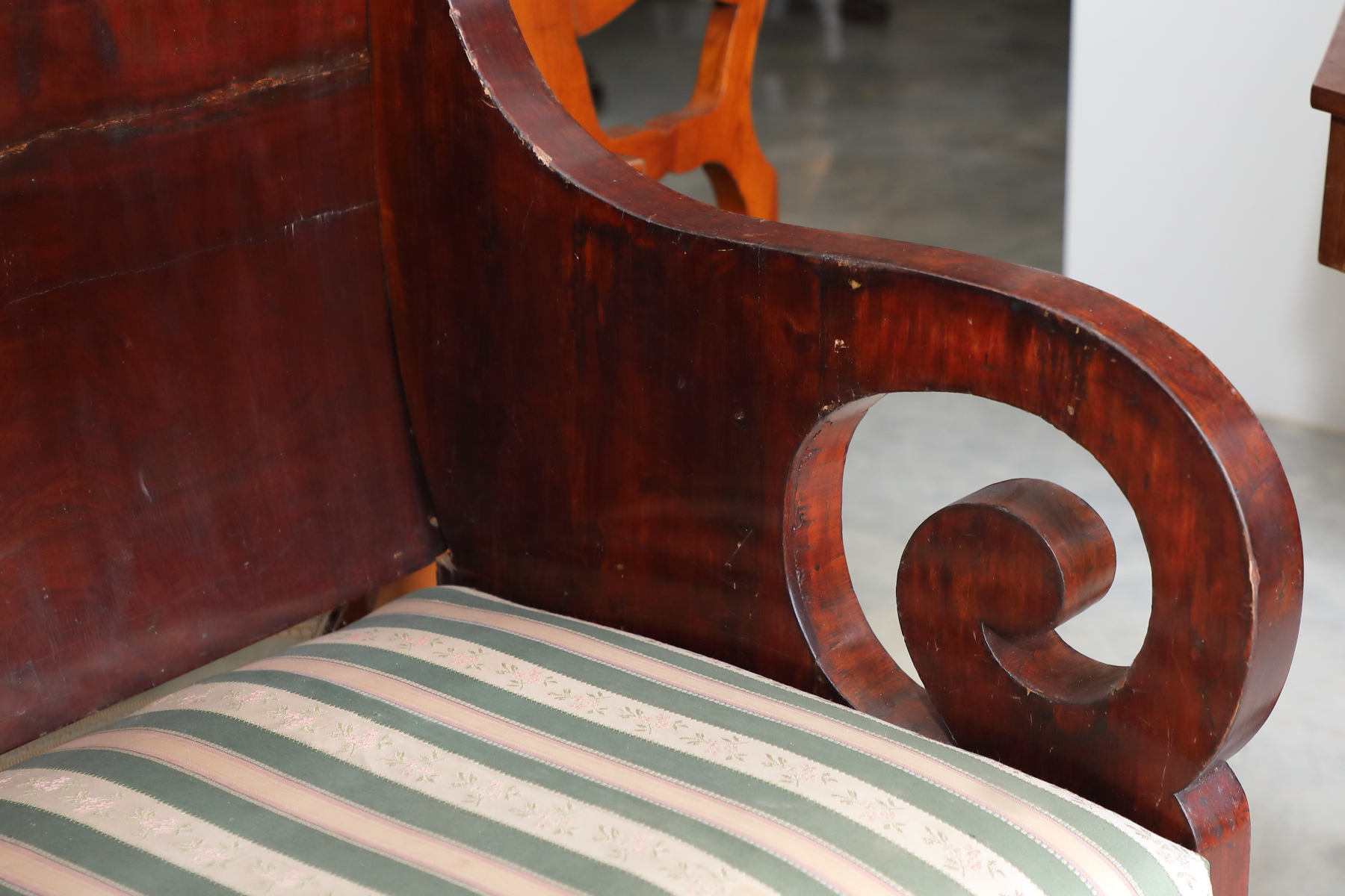 Divano in mogano di origine baltica epoca prima metà 800 con spalliera in legno ,seduta imbottita e braccioli a ricciolo.Dimensioni : 174x70xh.h.109