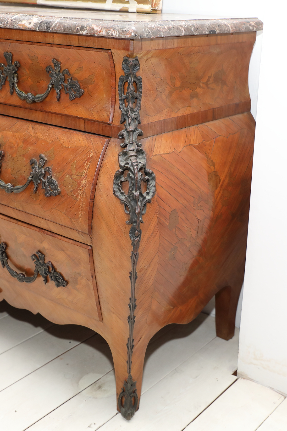 Grande comò a tre cassetti intarsiato su mogano e bois de roses.Fiori intarsiati in varie essenza ,gambe mosse ,importanti bronzi decorativi .Dimensioni : 143x55xh.93
