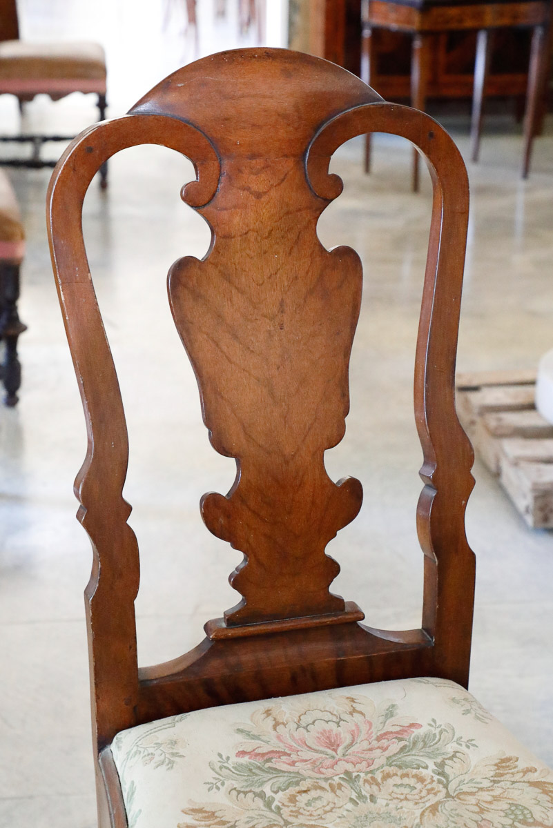 Gruppo di 8 sedie con schienale a pattona in noce, gambe mosse origine inglese epoca 800.