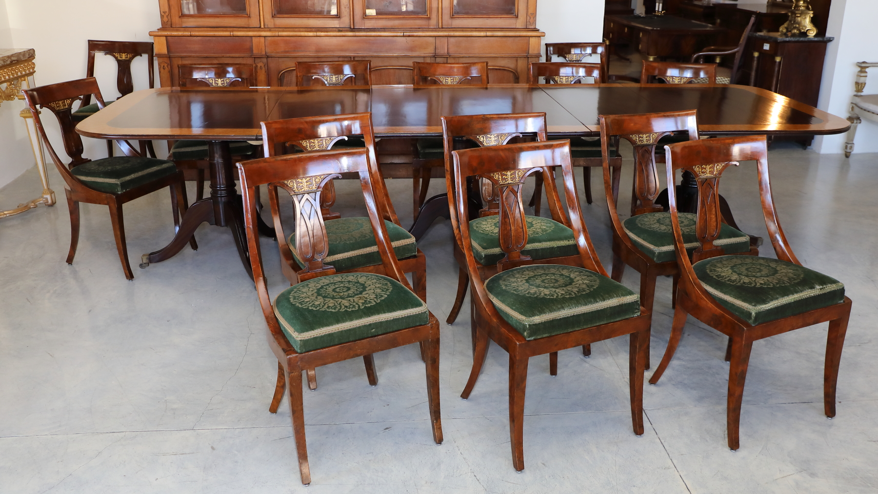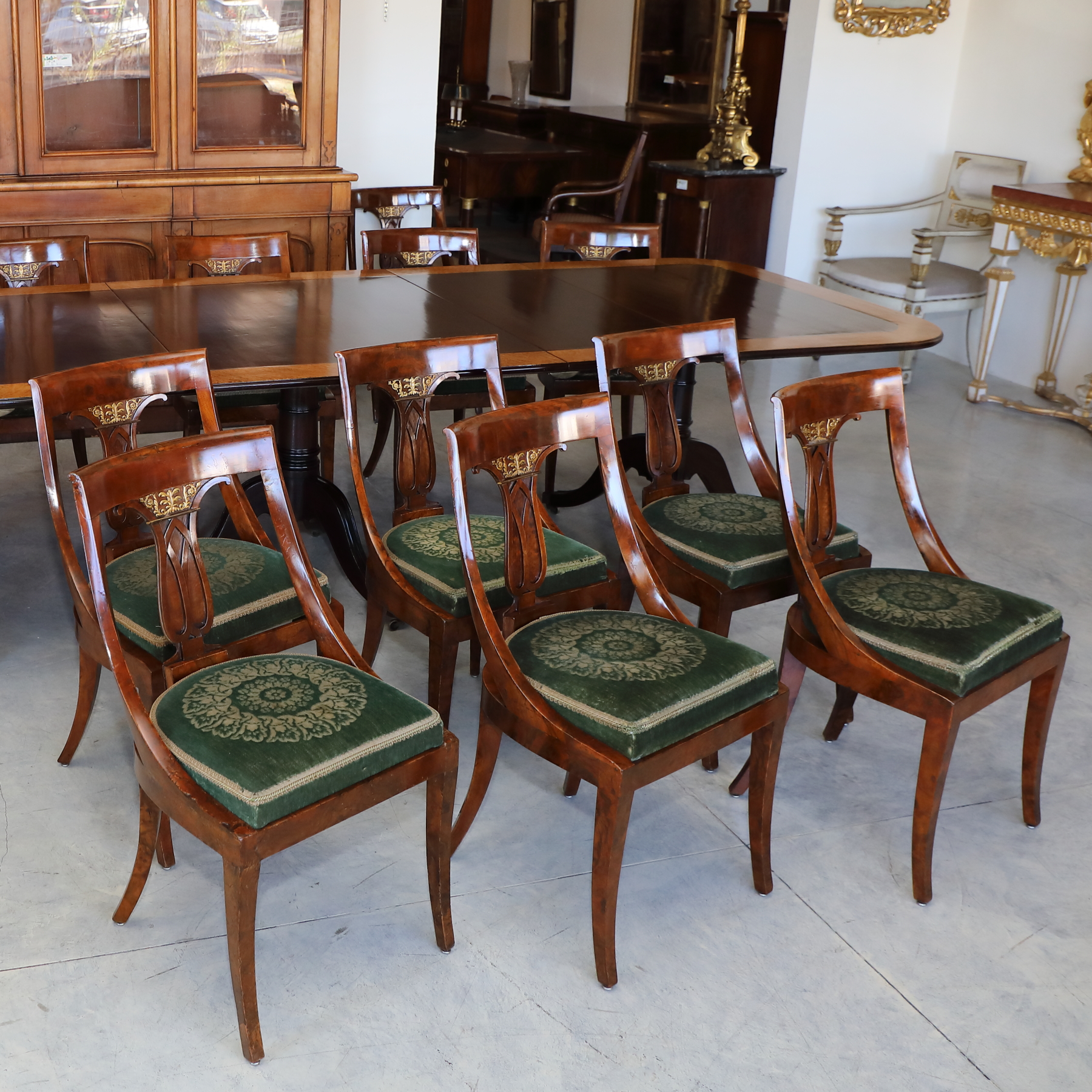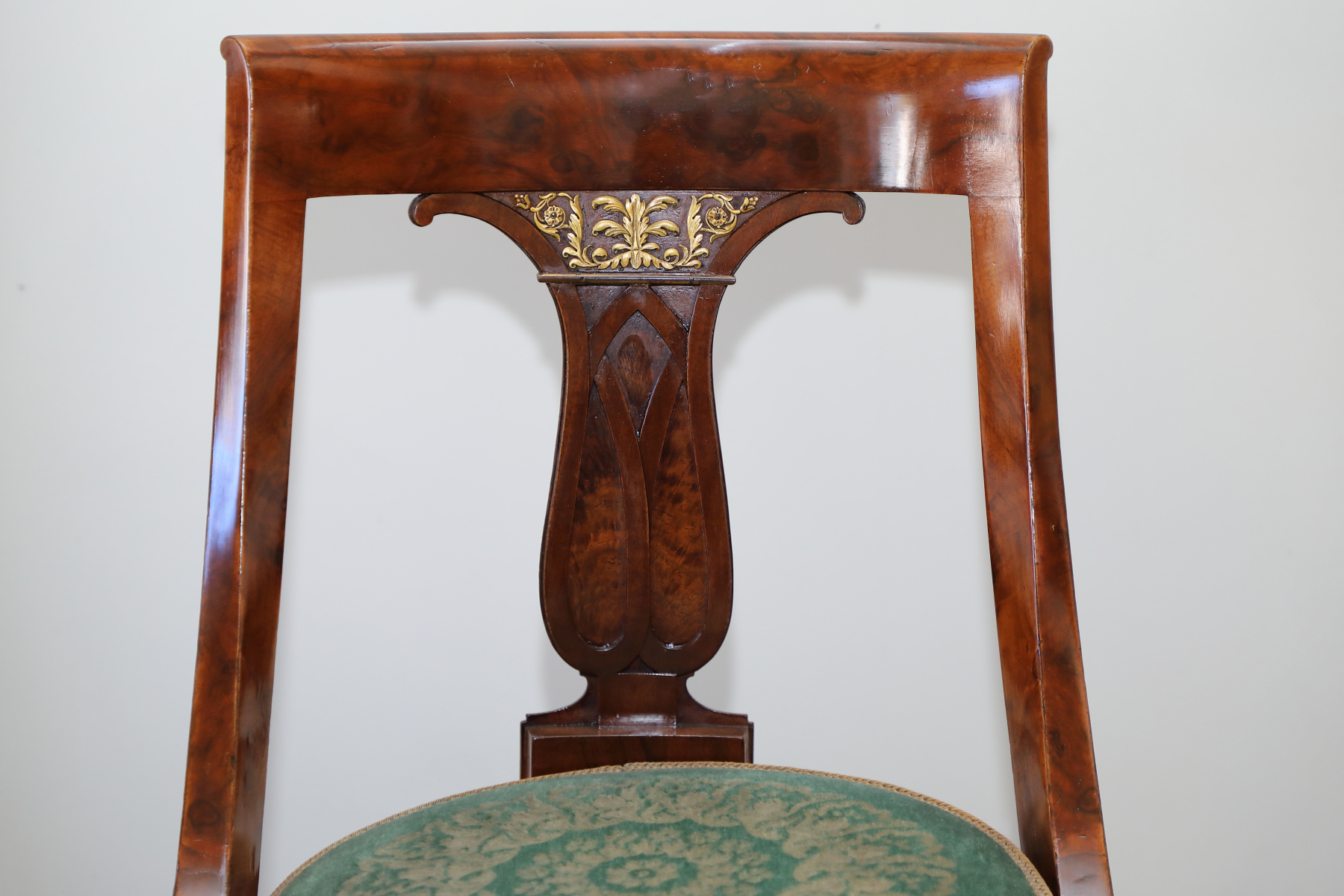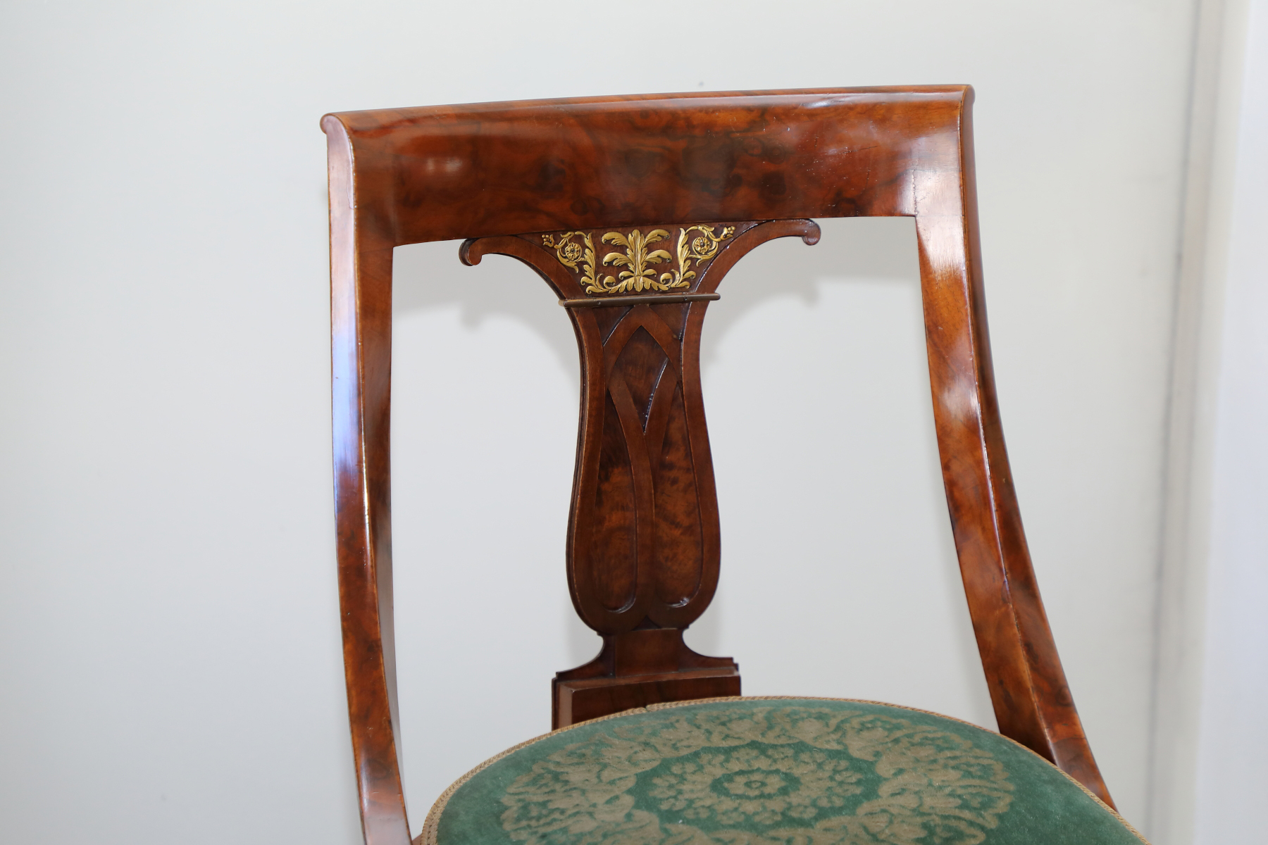 Gruppo di 14 sedie a poltroncina in radica di noce fine 800 con elementi in bronzo dorato sulla cartella centrale