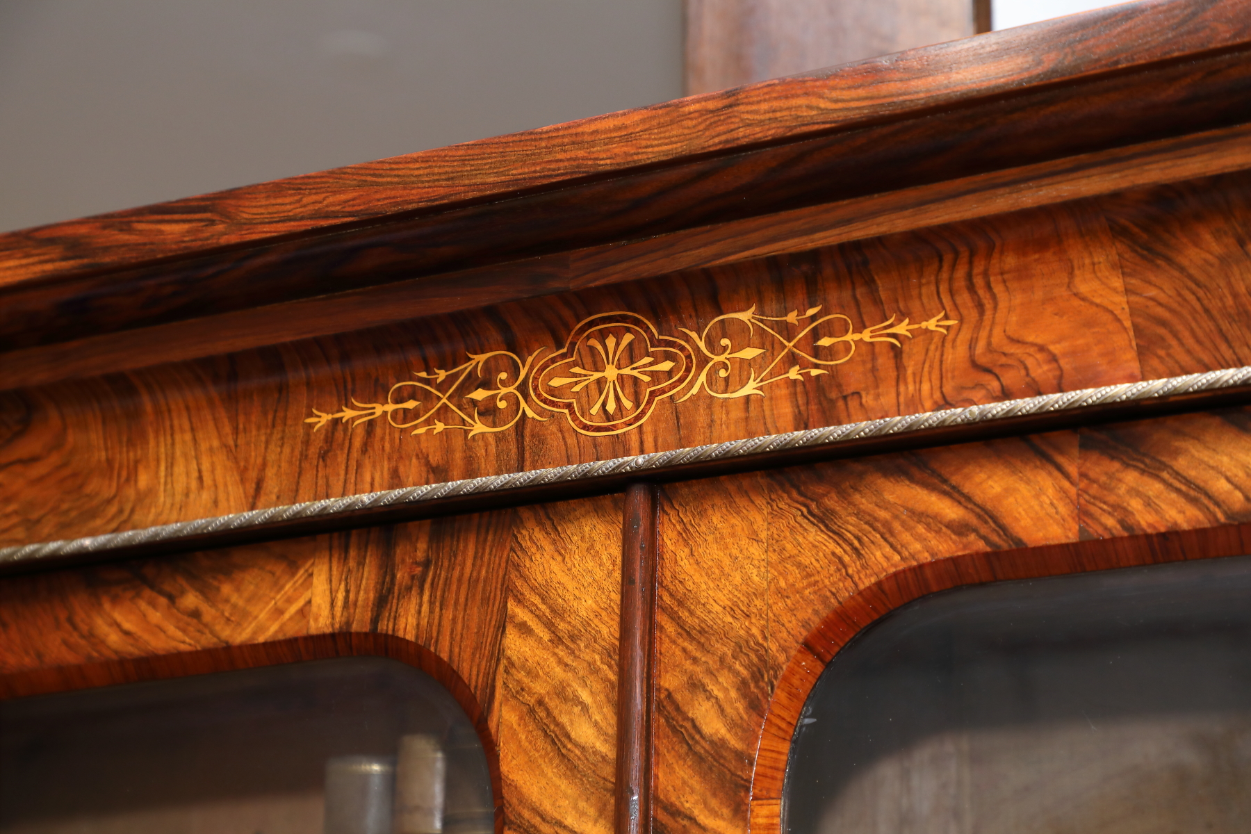 Libreria /vetrina in noce e radica di noce a due ante ,con sportelli pannellati nella parte sottostante e ante con vetri in quella superiore,intarsi e filettature in acero ,bronzi dorati decorativi Origine Inglese Epoca Vittoriana .Dimensioni : 120x41xh.204 Restaurata da mettere tessuto di rivestimento