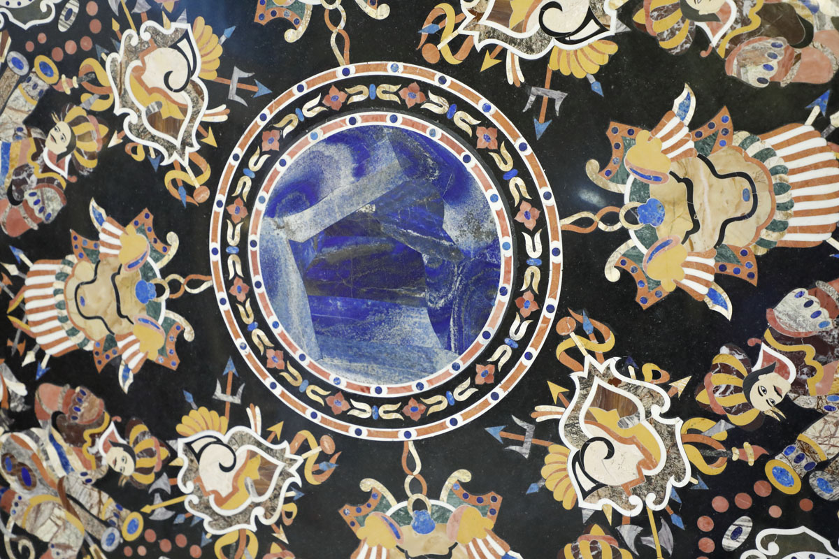 Piano di marmo rotondo intarsiato con pietre semipreziose, diametro 150.