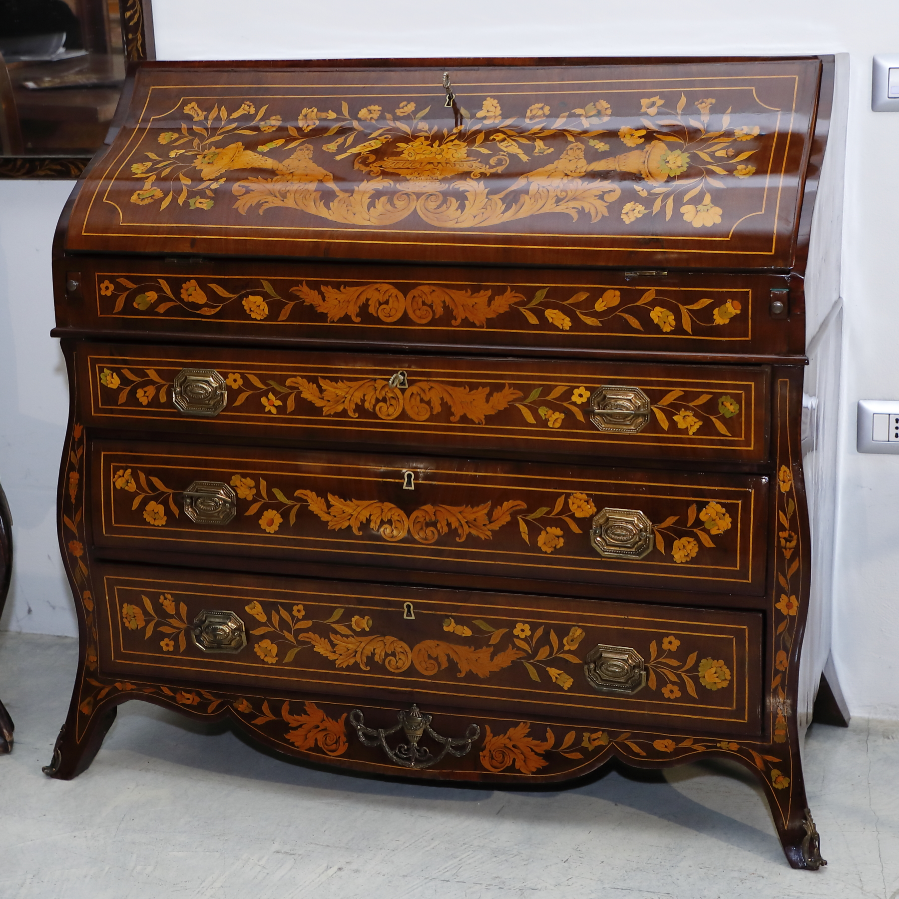 Ribalta con calatoia a serpentina intarsiata su mogano con motivi floreali in acero ,olivo ed altre essenze.Intarsi presenti sui tre lati ed anche internamente .Origine olandese Epoca Primi 800.