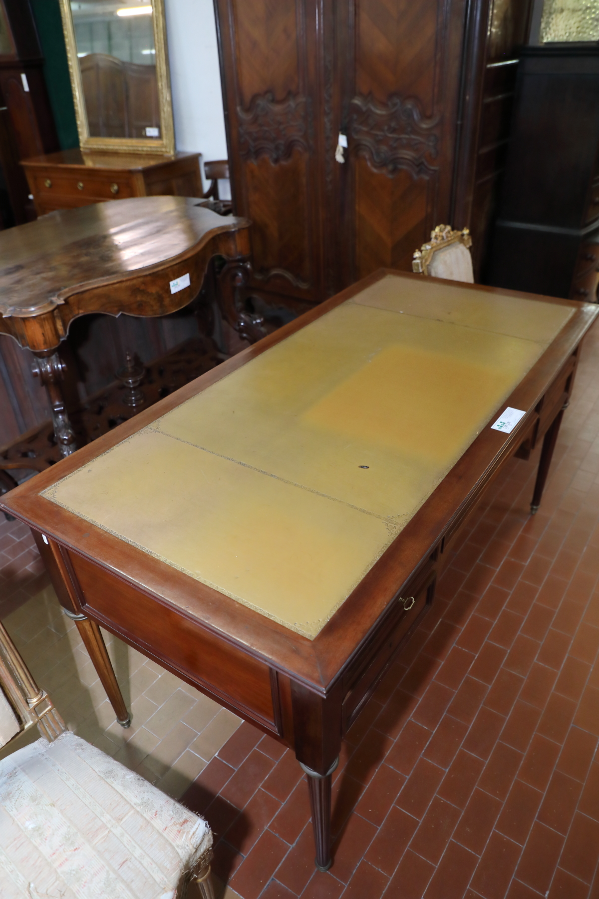 Scrivania da centro a 5 cassetti in mogano ,con piano rivestito in pelle,gambe tornite e scanalate .Misure : 160X83XH.79