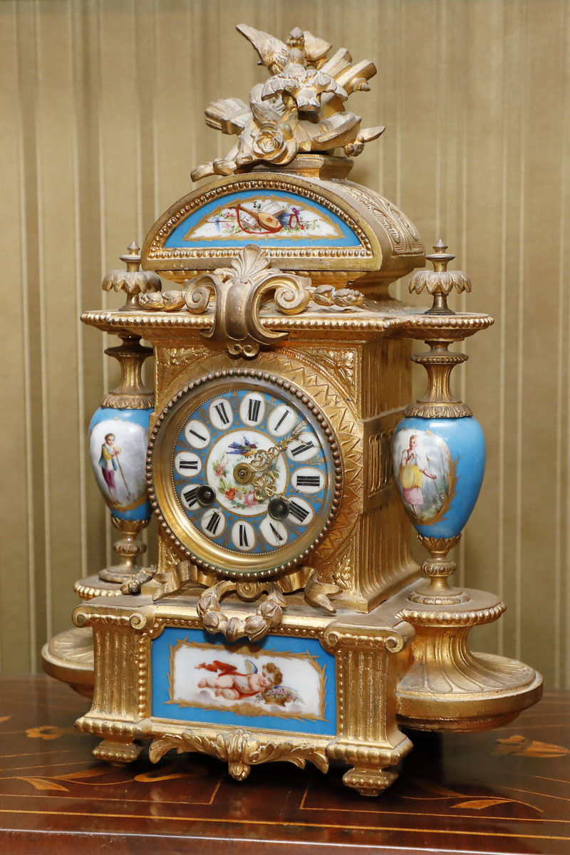 Set orologio e coppia di candelieri in bronzo dorato e placche di porcellana Sevres, Origine Francese, Epoca Napoleone III.
