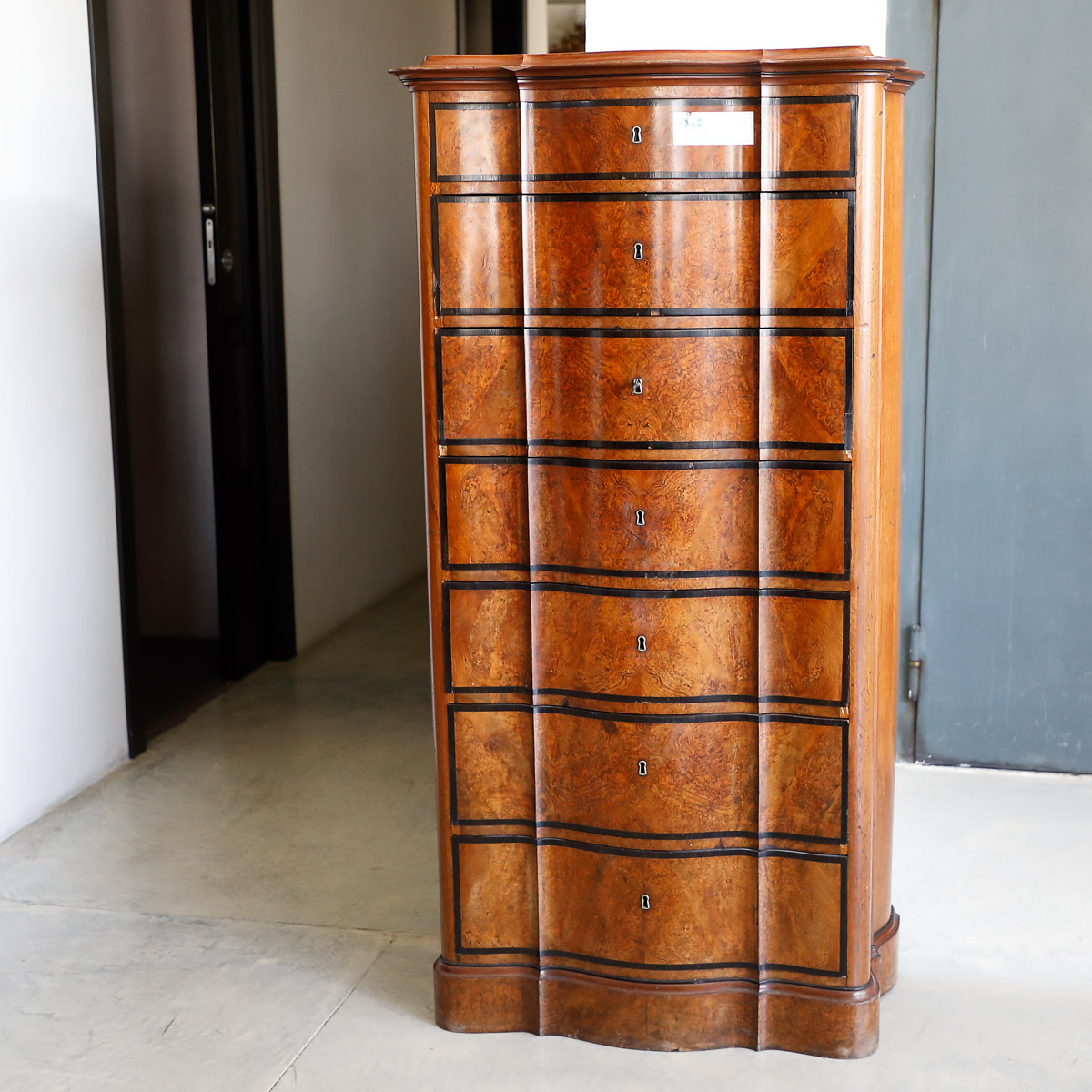 Settimino con frontale a serpentina in noce, radica di noce e legno ebanizzato , origine Paesi Scandinavi, Epoca Biedermeier.