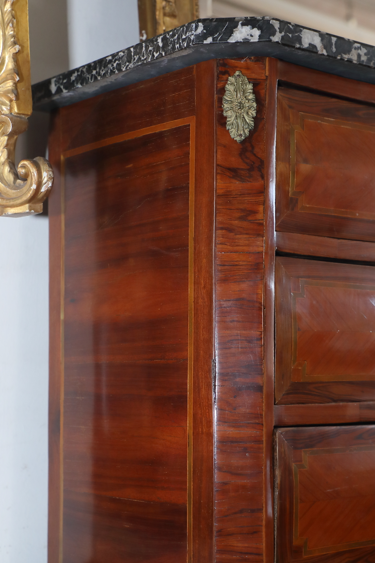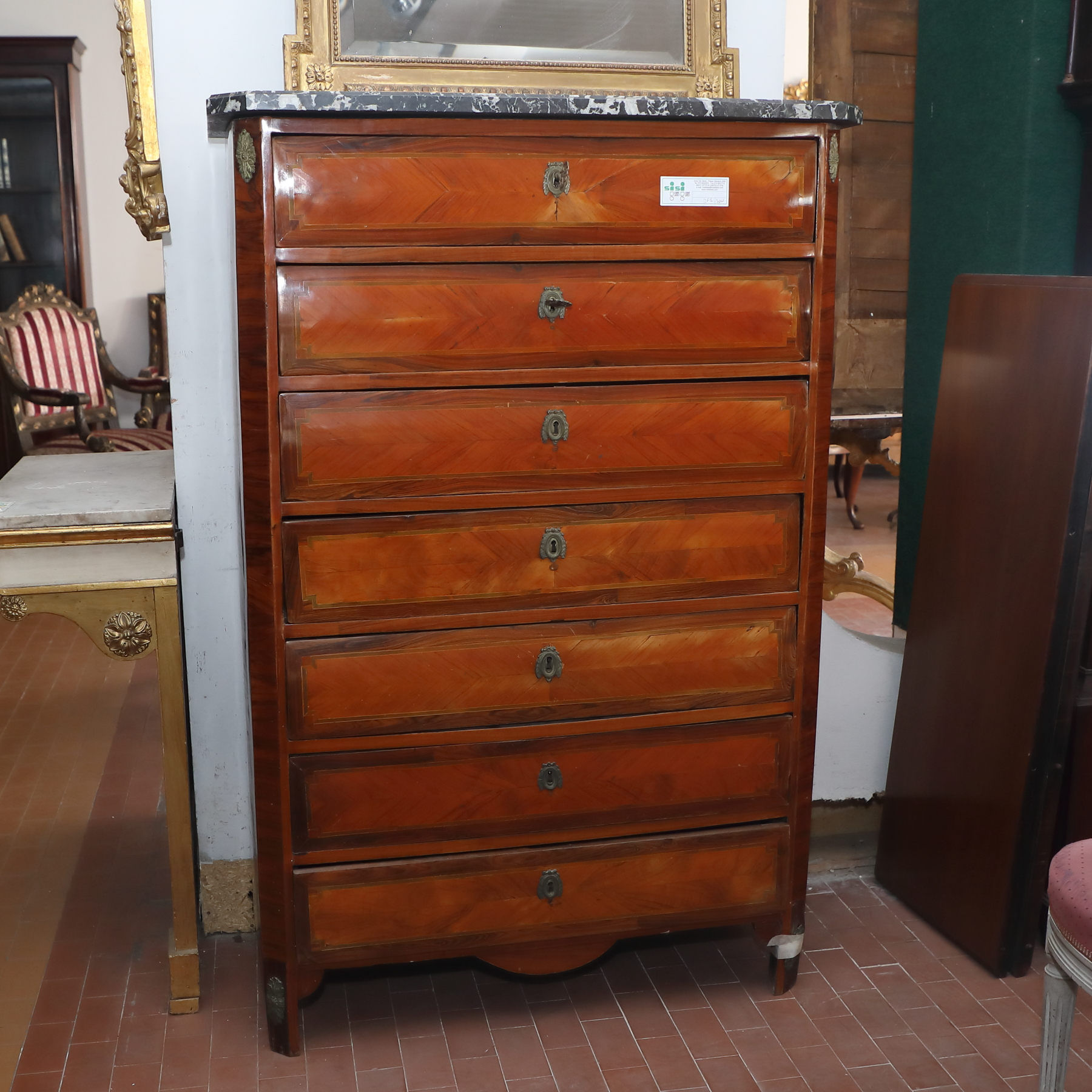 Settimino di origine Francese Epoca Napoleone III in bois de roses, noce e filettature in legno di olivo sui cassetti ,filettature in acero sui fianchi laterali .Bronzi ornamentali sui laterali e sui piedini .Dimensioni : 99x40x147h.