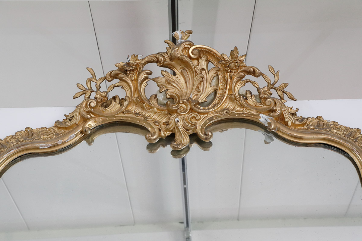 Specchiera rettangolare in legno dorato, con fregi e cimase intagliate.