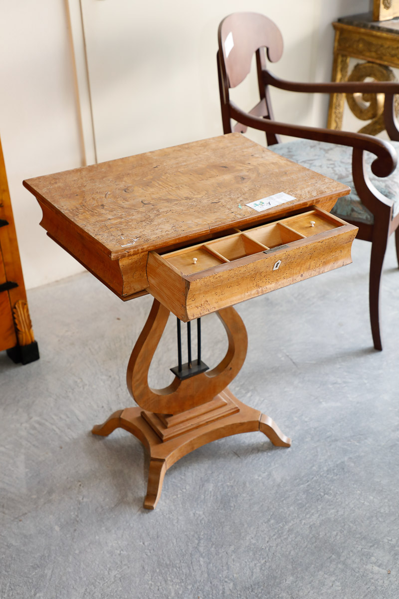 Tavolino in betulla corallina, gamba a lira, cassettino centrale, Paesi Scandinavi, epoca 800