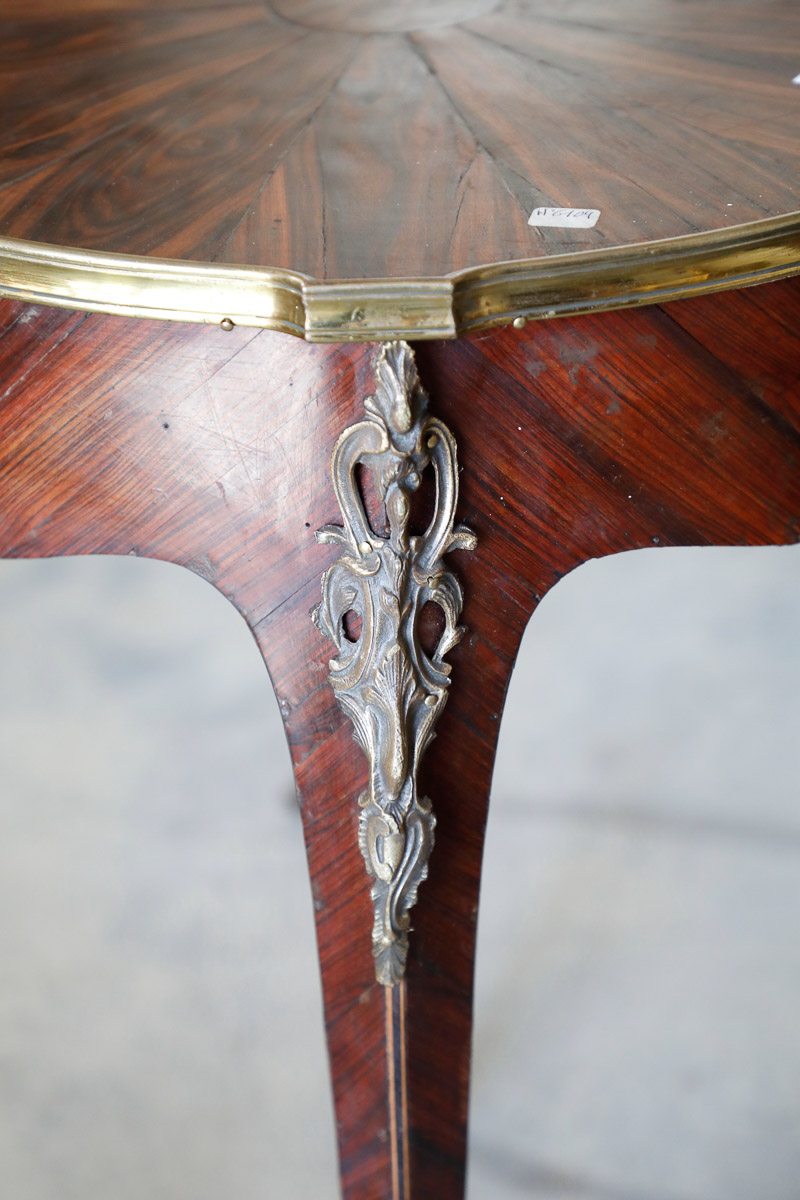 Tavolino tondo in bois de roses con gambina mossa, piano fiammato, finiture in bronzo dorato, Francia Napoleone III.