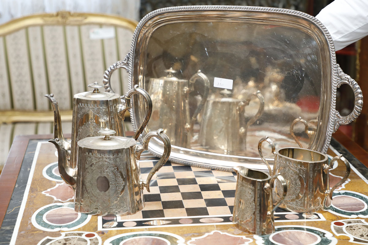 Vassoio con servizio 4 pezzi in Sheffield, Origine Inglese, Epoca Vittoriana.