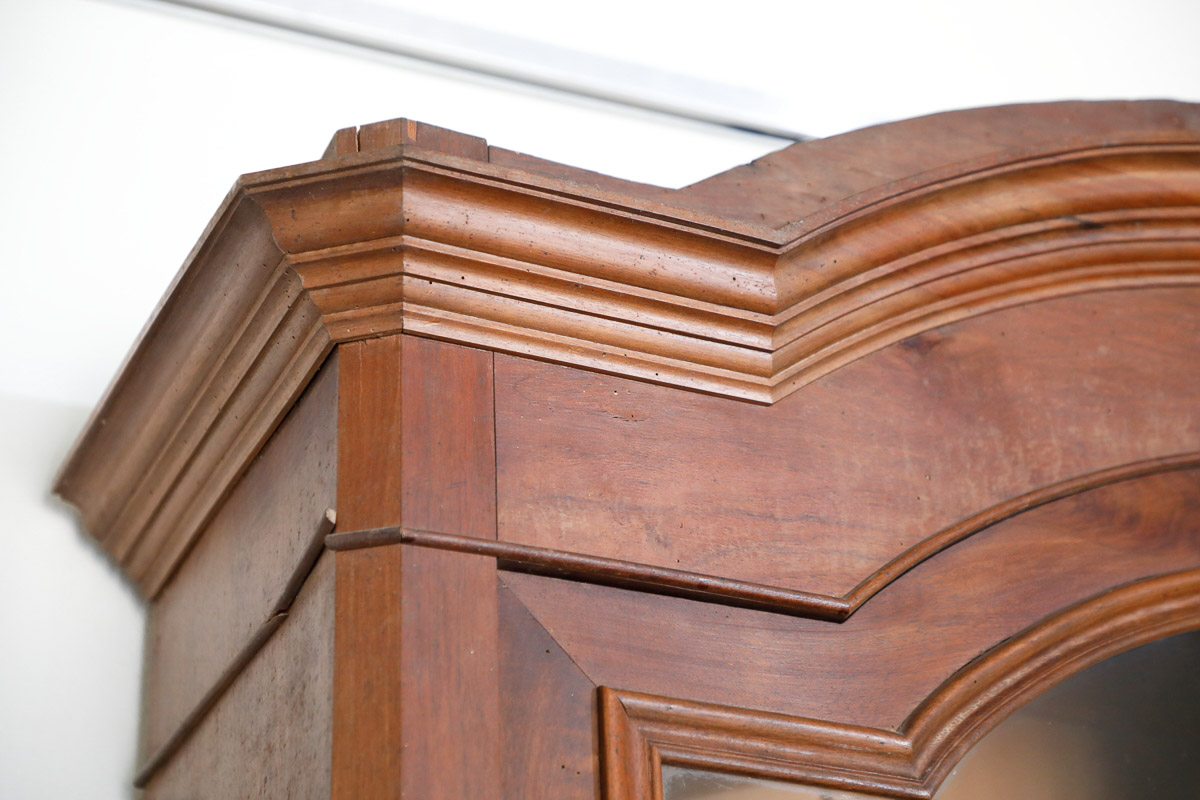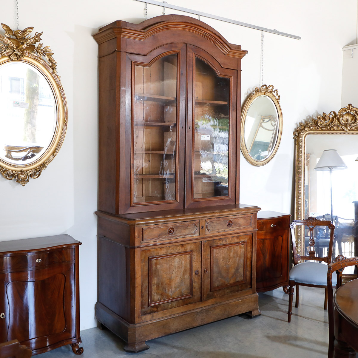 Vetrina in noce e radica di noce, con due cassetti e sportelli nella parte sottostante, sportelli a vetri in quella superiore, origine italiana, seconda metà 800.