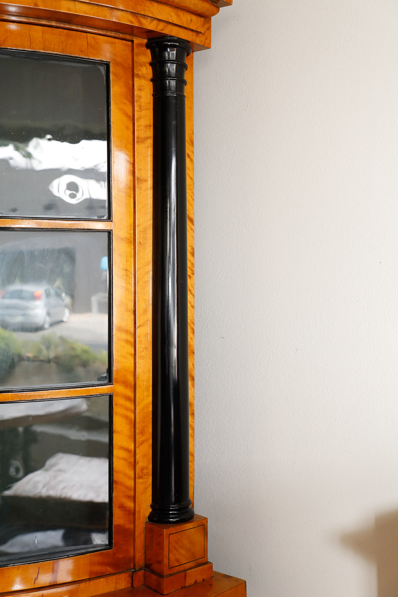 Double body corner cupboard, in birch, doors below, glass above, columns in ebonized wood, Scandinavian origin, second half 19th century