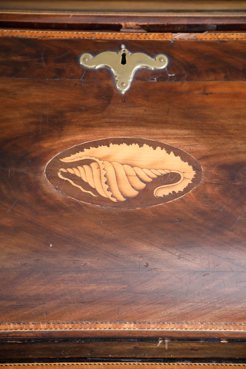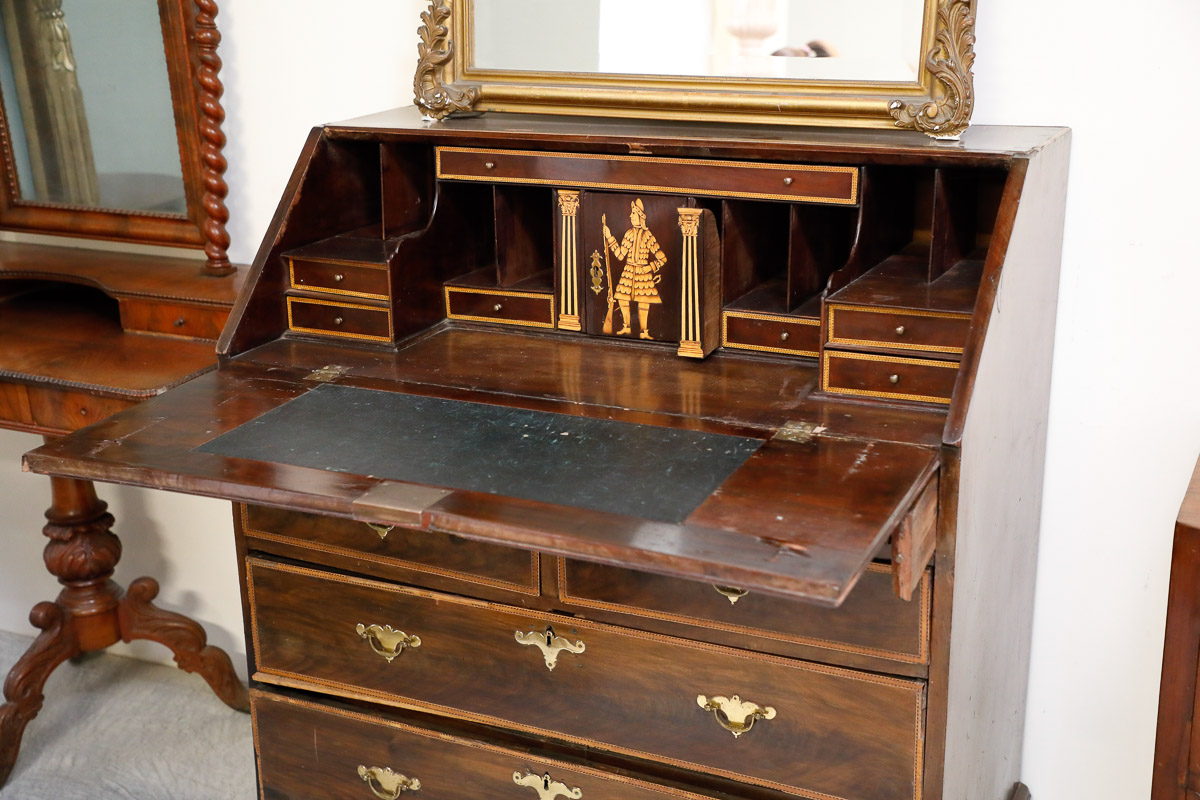 Flap chest in walnut with inlays and threading on the drop-front and drawers, inlaid character inside and secret drawers, England, early 19th century.