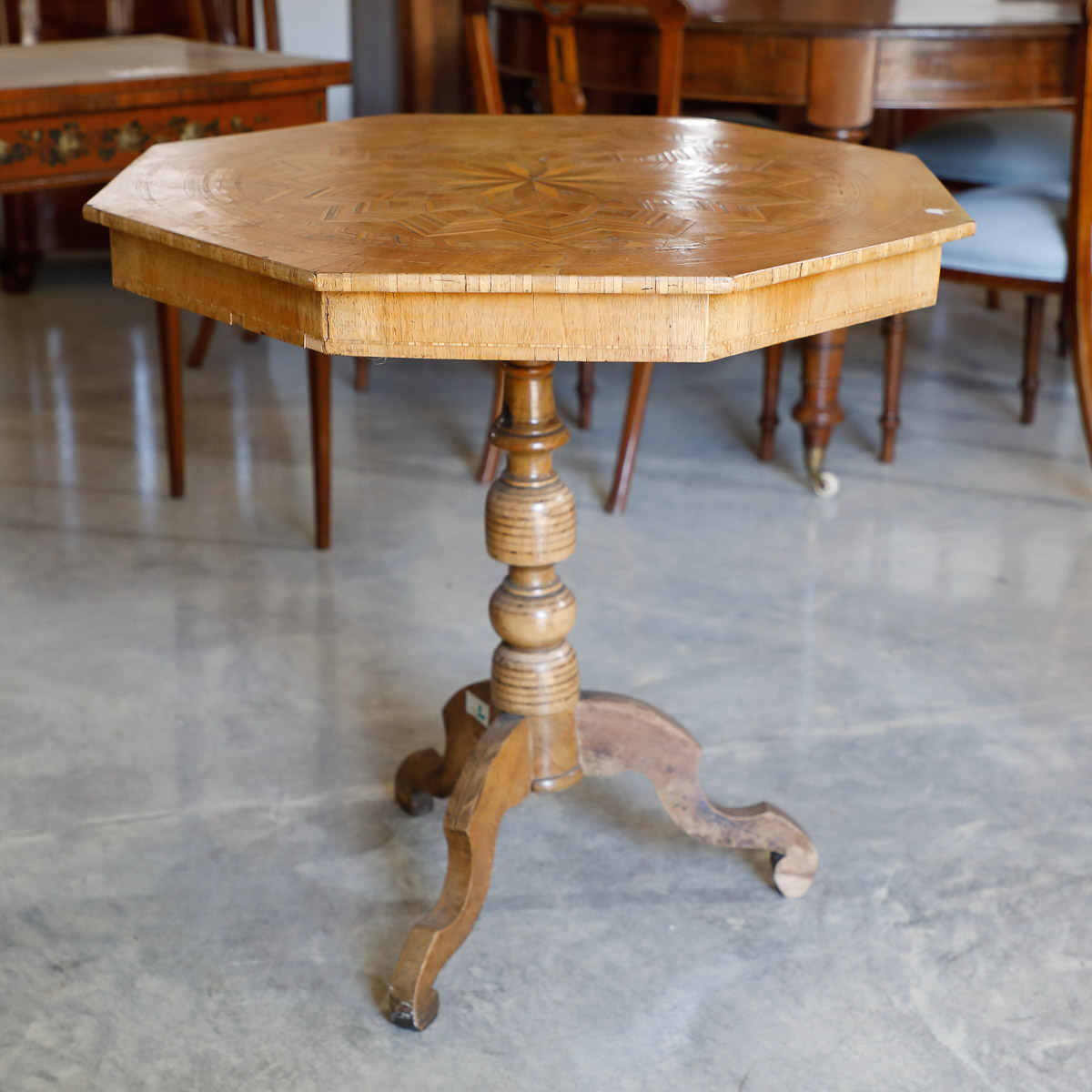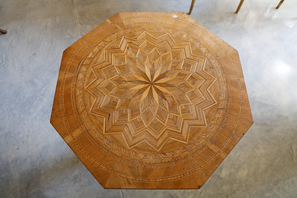 Octagonal occasional table in walnut with geometric inlays, Italian origin, second half 19th century.