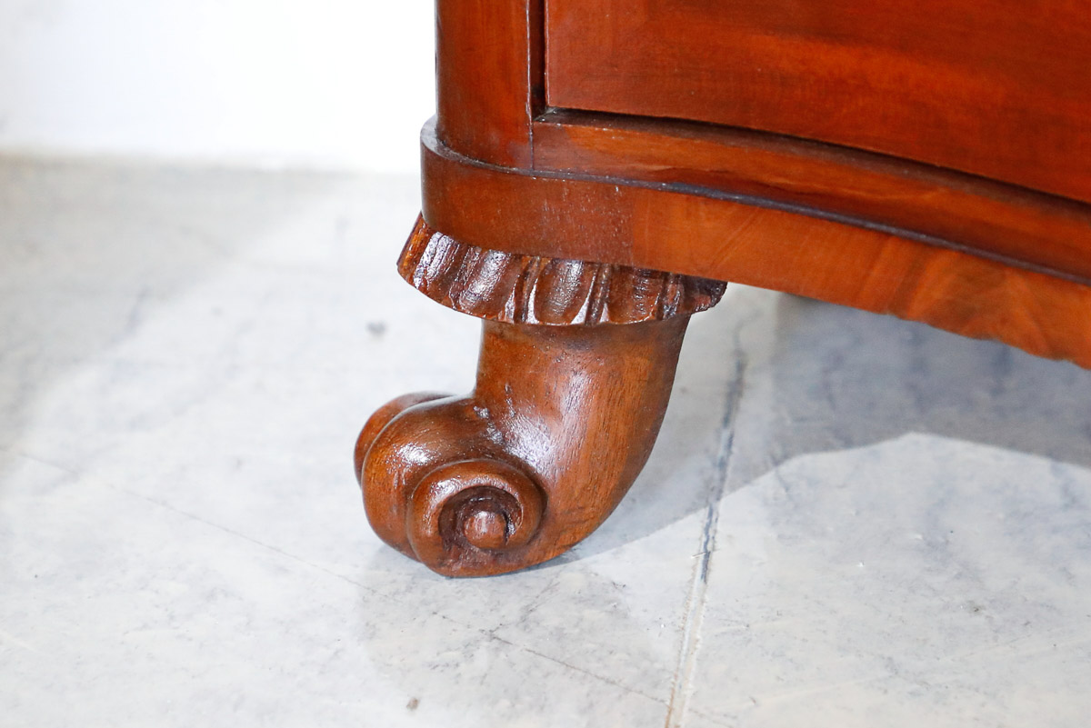 Pair of bedside tables with serpentine front, ivory key masques, curled feet, central drawer and small door, Scandinavian origin, Louis Philippe era.