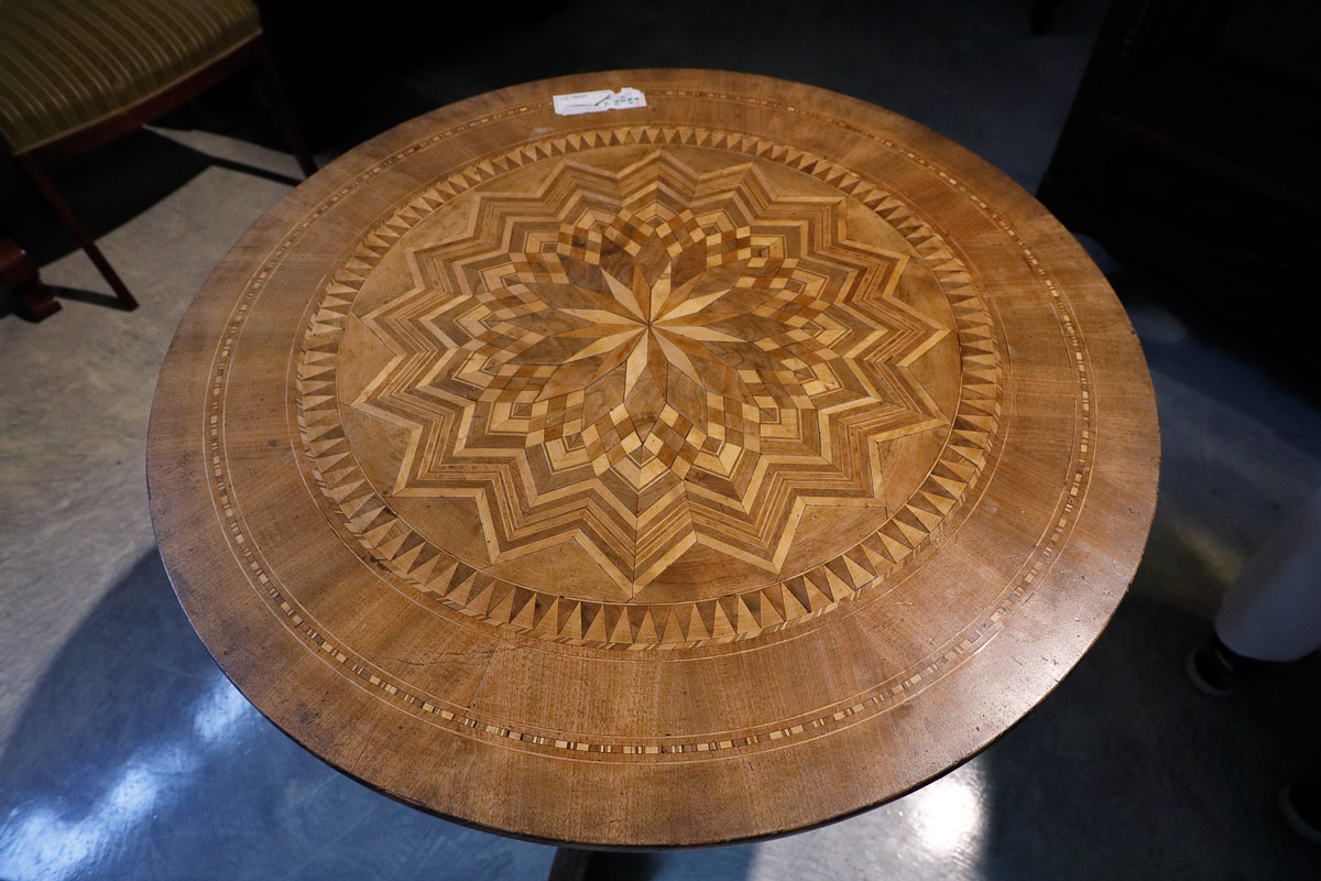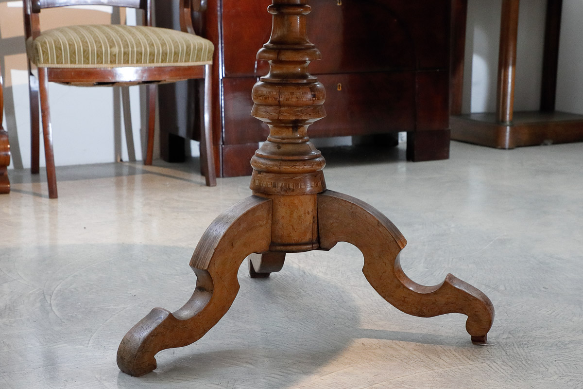 Round Sorrentino table with central leg in walnut, with inlaid top, ribbon inlay on edge of top and inlaid legs.