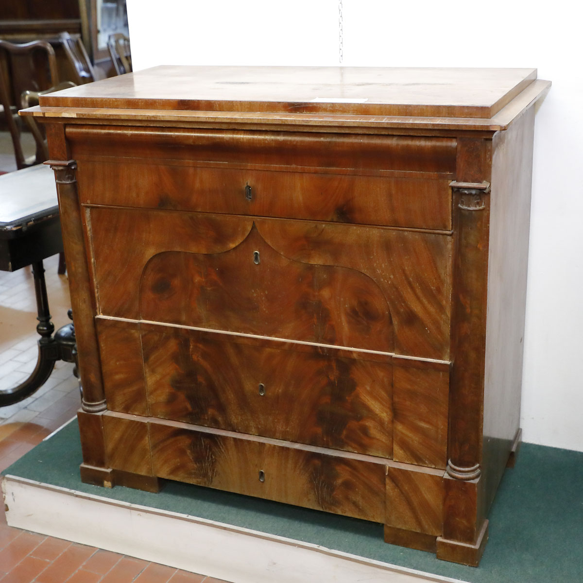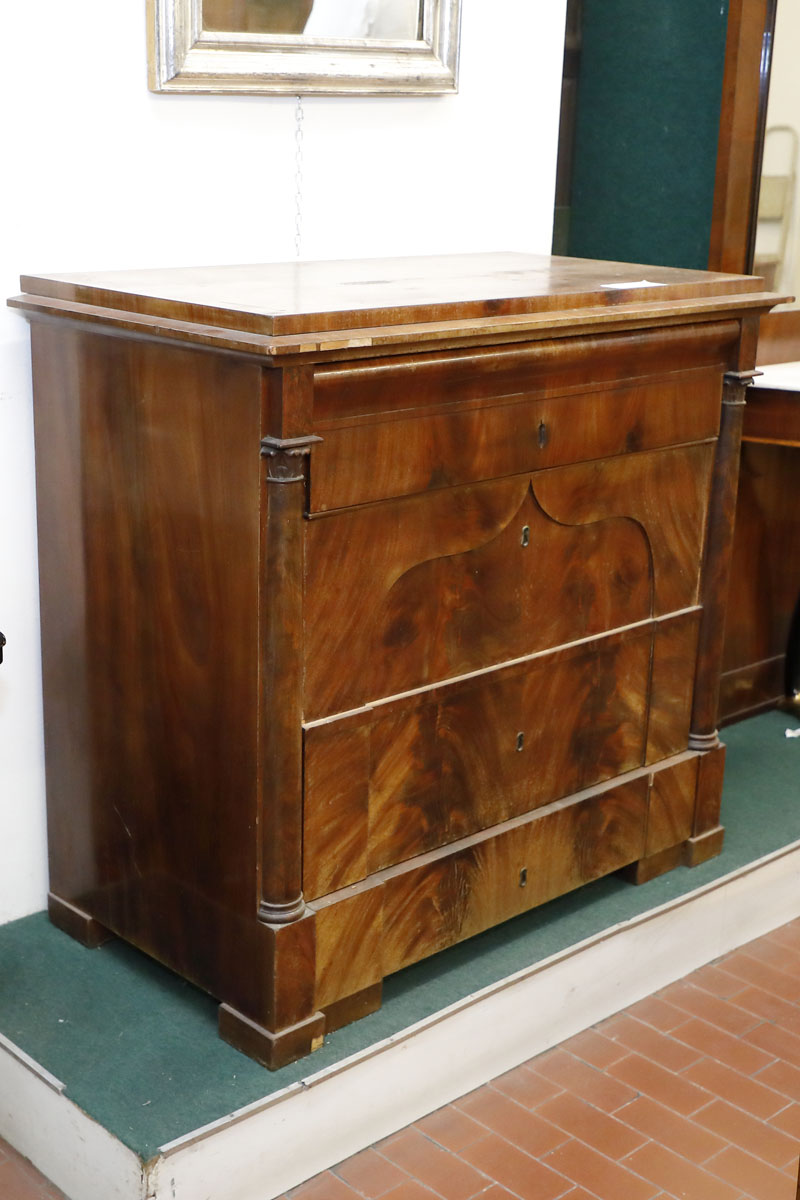 Small commode with 4 drawers in mahogany feather, side half column, Scandinavian origin, Biedermeier era.