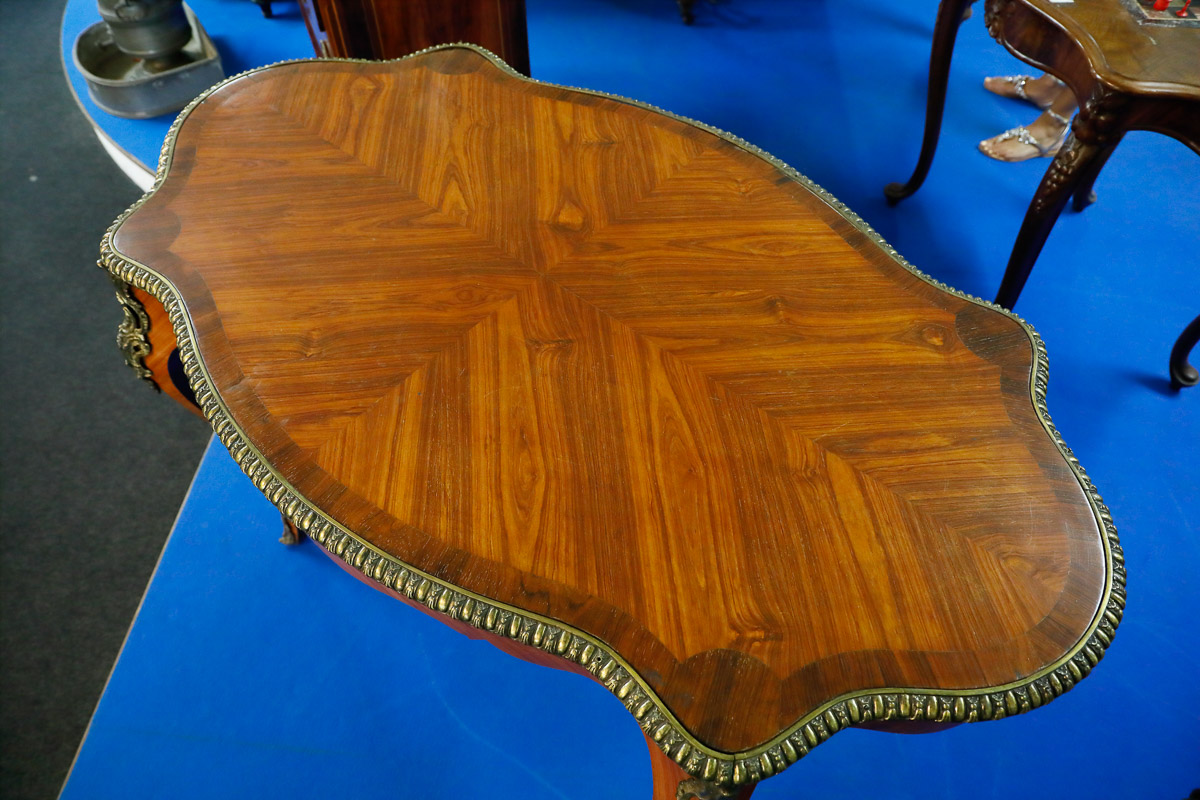 Writing desk in bois de rose, cabriole legs with gilded bronze edge and bronze friezes also on the legs, Sevres porcelain plaques, French origin, Napoleon III period.